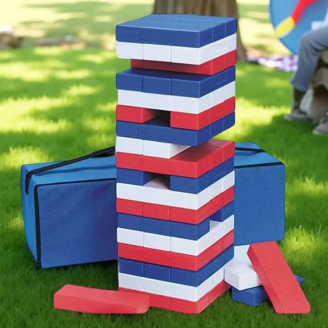 Giant Tumbling Blocks JENGA Style Game This giant version of the classic family game is one of cunning and skill. Build the tower then take it in turns to remove a piece and add it to the top without making the whole tower tumble. The higher you reach the more unstable and the bigger fun it becomes! 58 solid wooden blocks each 29cm x 7cm x 4.5cm Hi-Tower builds from approx. 0.9 m at the start of the game to around 1.5m during play.